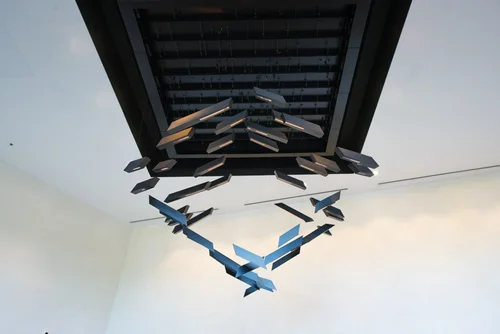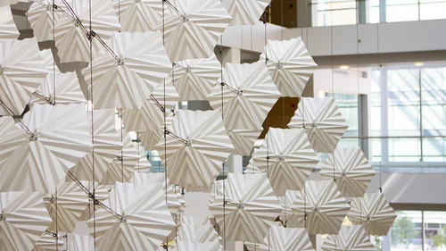 The sculpture represents both the vast emptiness of the night sky, but also the feeling of being connected and together. Designed to heighten the senses, the sculpture is at once delicate, strong, reflective, and ephemeral. The landscape holds the sculpture carefully and softly within it, integrating additional opportunities for seating for contemplation, and reflection, and remembrance.