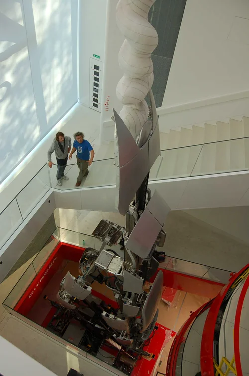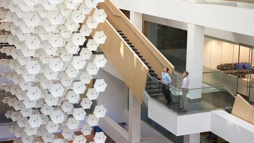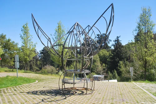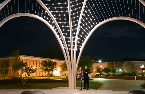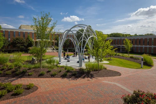 The memorial includes an interactive sculpture made of large steel arcs grounded with six pillars, one to represent each person killed and wounded. The crisscrossing arcs rise 25’ above a white granite plaza, creating a voluminous ceiling that hovers above a circular gathering space embraced by planted landforms and an arc of trees, flowers, and plants. Two narrow, arcing paths unfurl from the plaza, passing through lush native gardens that bloom white in the spring to commemorate the anniversary of the shooting and purple in the fall to welcome students back to campus. Sculpted stone pebble seats sit below the constellation and are designed to hold a reclined body comfortably – smooth and soft.